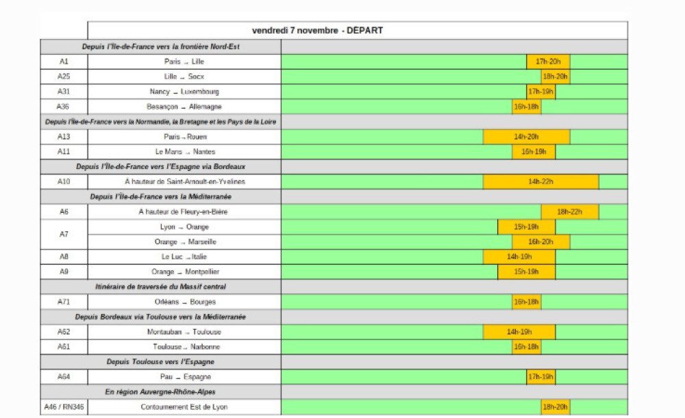 La journée du vendredi 7 novembre est classée jaune. Des ralentissements et embouteillages sont à prévoir en direction de la côte normande (A13), du Nord-Est de la France (A1, A25, A31, A36), de la côte atlantique (A11, A64) et de la côte méditerranéenne (A7, A8, A9, A61, A62). Il est conseillé d'éviter ces axes routiers l'après-midi entre 14h et 20h. "La circulation pourrait s'avérer difficile jusqu'en milieu de soirée surtout si les conditions météorologiques sont mauvaises", prévient Bison Futé.