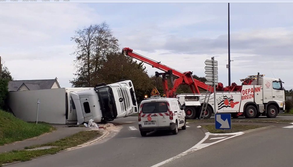 Mercredi 5 novembre, à 7h30 du matin, un semi-remorque immatriculé dans le Maine-et-Loire et transportant de la viande conditionnée est resté couché sur le bord de la route à Evron (Mayenne), boulevard Maréchal de Lattre de Tassigny/ boulevard Maréchal-Joffre, au rond-point de la route de Sainte-Suzanne.
