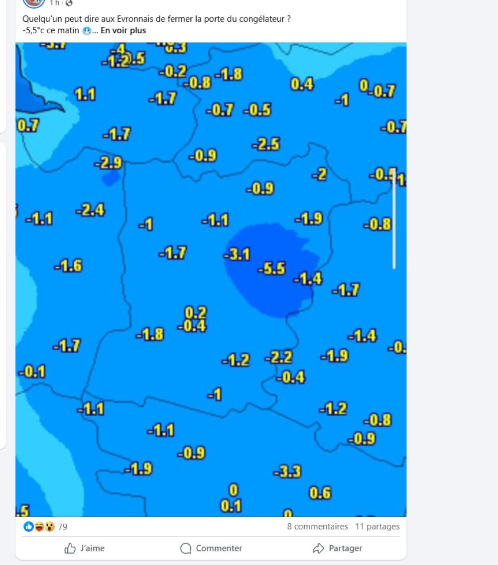 Dur d'être un Mayennais en hiver… Jeudi 20 novembre, une commune dans les Coëvrons a décroché le record de la station météo la plus froide de France. En matinée, Météo Mayenne a enregistré -5,5 degrés à Evron. Plus tôt dans la semaine, mardi 18 novembre, la commune s'était déjà distinguée comme une des stations les plus froides du nord-ouest avec une température de -4 degrés. Malgré le froid glacial de ce matin, ce n'est toujours pas un record mensuel puisque le 17 novembre 2007, - 8,4 degrés avaient été enregistrés.